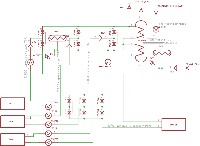 Teploty v systému jsou snímány pomocí devíti teploměry.